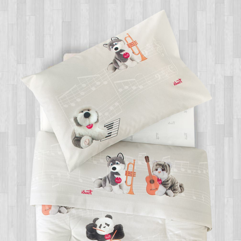 Completo Lenzuolo Lettino Orchestra – Dolcissimi animaletti per il completo lenzuolo della Collezione Trudi Home di Somma1867 stampato su tela di puro cotone. Disponibile nella varinate grigio naturale , è composto da lenzuolo motivo piazzato 120×180, federa piazzata double-face cm 40×60 e sottolenzuolo con angoli cm 60×130